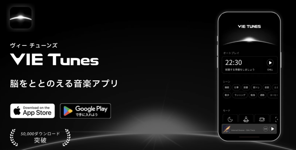 その一例が VIE Tunes(ヴィーチューンズ) です。VIE Tunesは、音楽を聴いたときの脳の状態を測定し、その変化を分析することで効果が確認された楽曲のみを「ニューロミュージック」として配信している音楽サービスです。